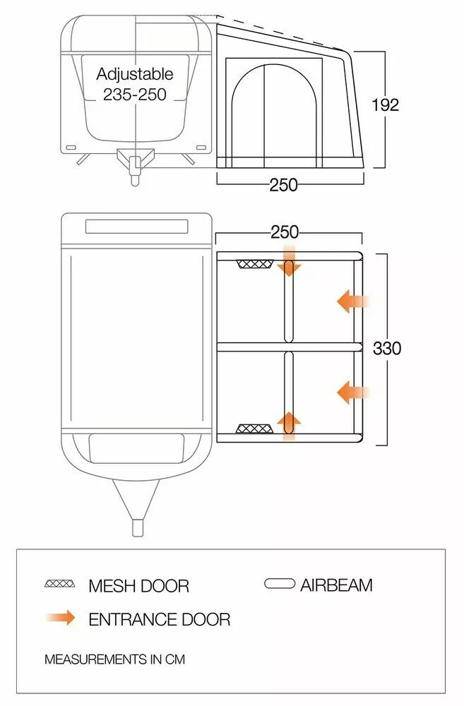 The Balletto 330 Air Pro is really versatile, with ample living space, and has the ability to remove side doors, zip on an additional side annex, storage space, or additional sleeping space. Further to this, there are optional front mesh doors, which can be zipped in place of the front doors, for bug-free mesh ventilation. All of these accessories are sold separately, or as part of the bundle deals below!