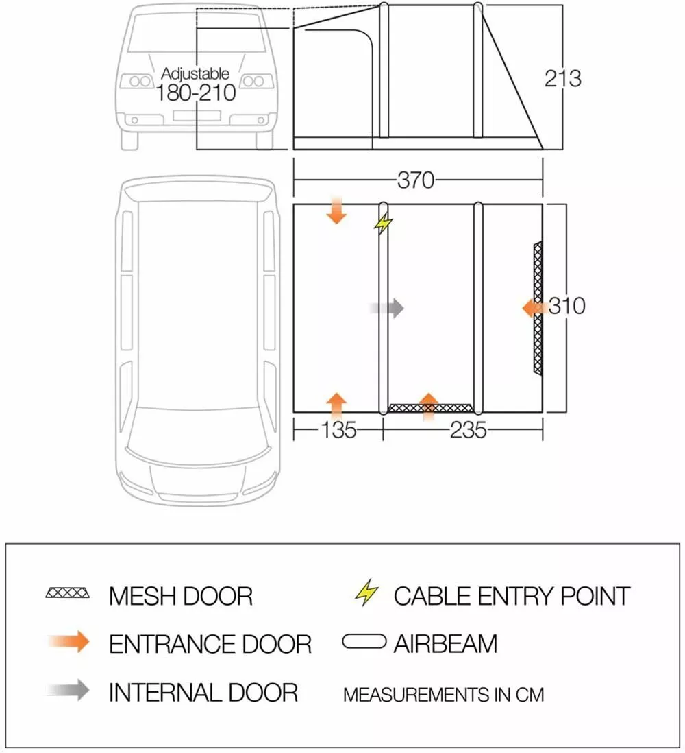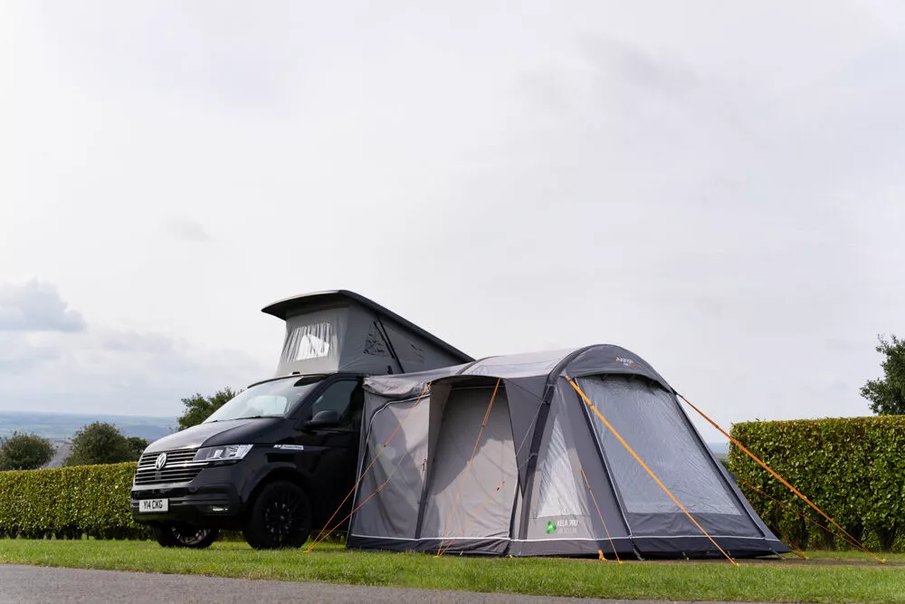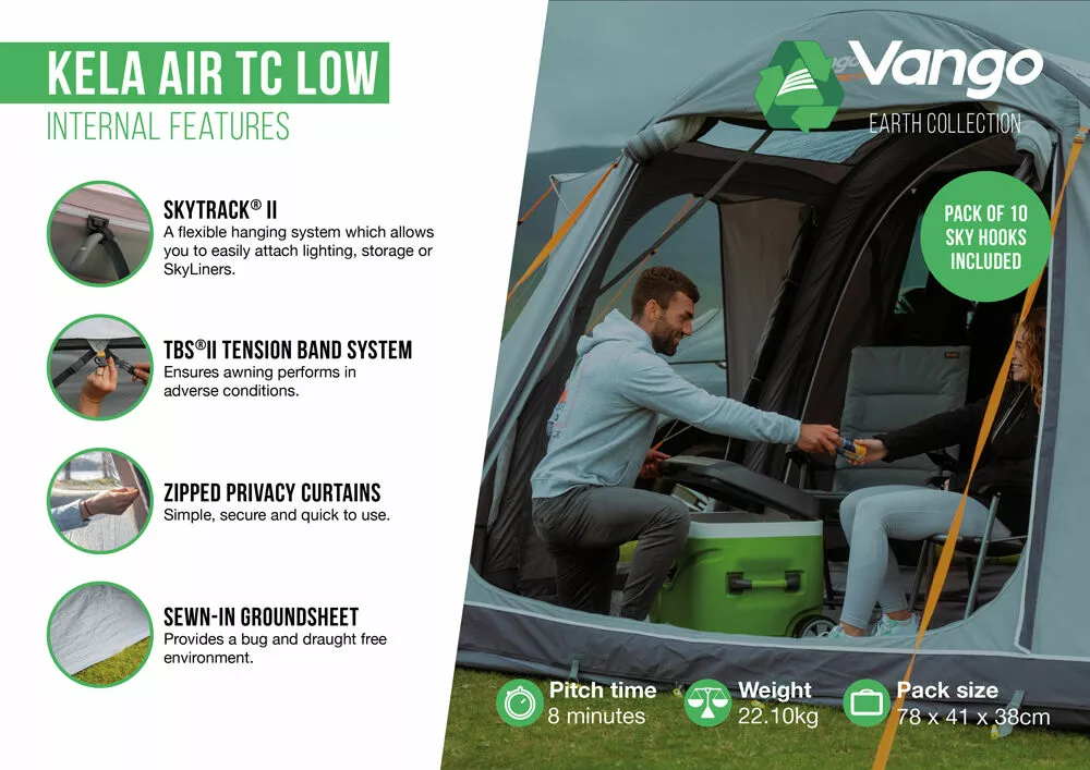 The Vango Kela TC Air Low is the ideal companion to any camper van, offering additional living space, and storage space, with a quick and easy Airbeam pitching system. Now featuring the Eco-friendly polycotton fabric for varying climates and internal bracer beams are included for increased rigidity.